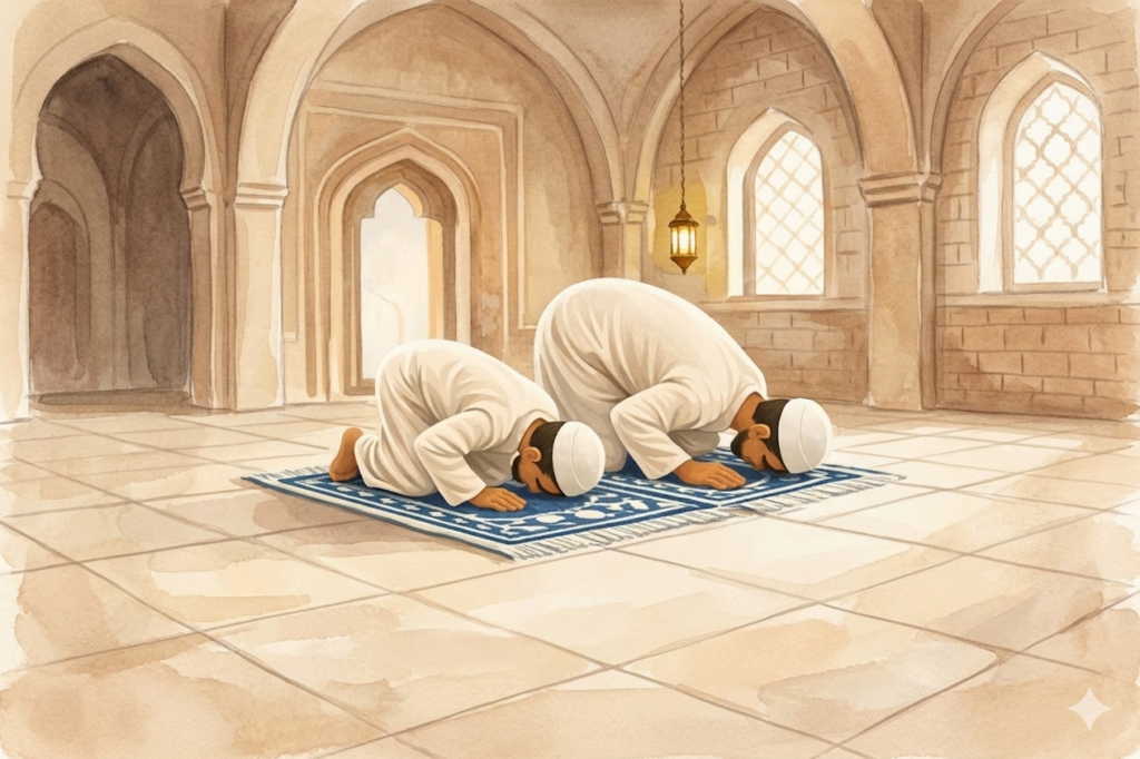 La prière peut être accomplie individuellement, mais la prière en groupe à la mosquée renforce la fraternité et l’unité des musulmans. Les fidèles se tiennent alors épaule contre épaule dans une même direction : la Kaaba, à La Mecque.